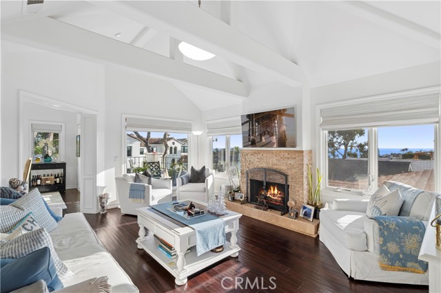 Situated on an elevated corner lot, this remodeled residence offers breathtaking, wraparound panoramic views from the main living spaces and front courtyard, encompassing the Ocean, Catalina Island, city lights, Fashion Island, and Pelican Hill golf course. A quintessential front courtyard provides a peaceful sanctuary for enjoying the ocean blues, complete with a built-in firepit, water feature, BBQ and prep counters. Thoughtfully updated throughout, the home boasts soaring ceilings, rich hardwood floors, elegant wainscoting, and expansive windows with custom treatments that frame the dramatic vistas. Cascading quartz countertops, newer appliances, abundant cabinetry, and a breakfast bar define the kitchen, which seamlessly flows into the dining area. A striking stacked-stone fireplace with hearth, flanked by walls of glass, centers the living room. Additional amenities include: central air conditioning, an alarm system, inside laundry, and generous storage. French doors open from the primary suite to reveal blackout shades, a luxurious bathroom with dual sinks, ample storage, an expansive walk-in shower with multiple showerheads, and a large walk-in closet. Two secondary bedrooms, all on the same floor, share an elegant bathroom featuring a tub/shower combination, a sizable vanity, and stunning imported Spanish tile. Completing the home is a finished garage appointed with California Closets® built-ins, epoxy flooring, and a large wall mirror. With three bedrooms and two-and-a-half baths, this home blends spectacular views with thoughtful upgrades, just down the street from Little Corona. Live the Corona del Mar Lifestyle with proximity to famed beaches, blue-ribbon schools, fine dining, and exquisite shopping.